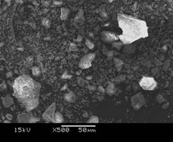图1球磨机颗粒形貌 图2卧辊磨颗粒形貌 卧辊磨粉磨物料颗粒级配分布比较合理,唐山新宝泰钢厂利用卧辊磨生产的钢渣微粉,比表面积460㎡/㎏左右,其中3μm~32μm颗粒占70%以上。